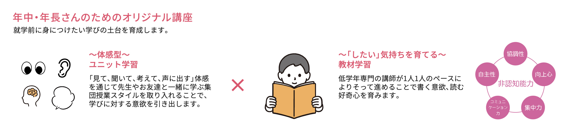 学びの楽しさを伝え、集中して学ぶ力を育むカリキュラムを提供。4歳から5歳のこの大切な時期は、お友だちの意見や行動に興味を持ち始める頃。少人数の集団授業を通して、協調性やコミュニケーション力を養いながら、自ら考え解決する力を伸ばします。これにより、小学校生活で必要な基礎力をしっかりと身につけることができます。