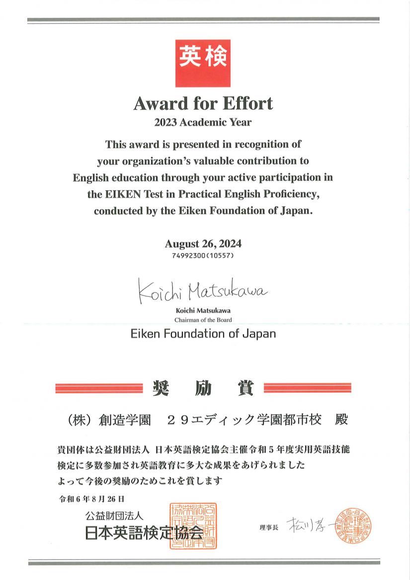 【日本英語検定協会より奨励賞をいただきました!】