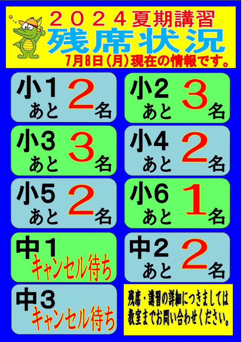 おかげさまで、一部の学年は満席となり、現在キャンセル待ちの状態です。
