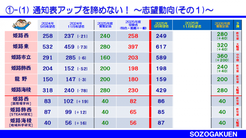 姫路西・姫路東・姫路飾西の3校で各1クラス増。
