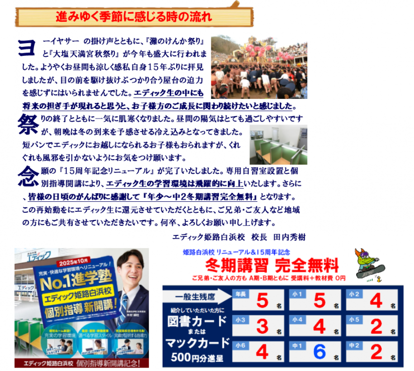 姫路白浜校に個別指導コース新設!【開校15周年リニューアル ①】