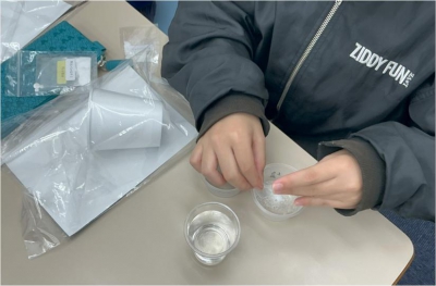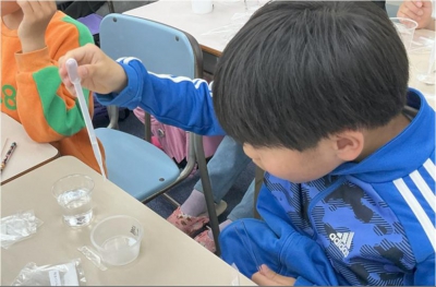 この日は吸水性ポリマーを使った実験を行いました。子どもたちは実験が大好き!小学4年生は初めてのエディックの実験に夢中な様子でした。