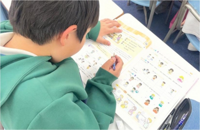 だからこそ授業中は楽しく、リピートをして発音をしながら、読みの問題にチャレンジし、最後に書く練習をします。