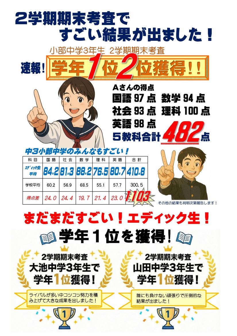 【速報!】3学期実力テスト 山田中学2年生で「5教科学年1位獲得!」