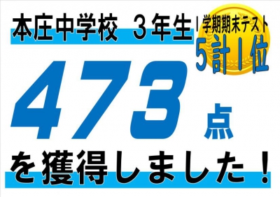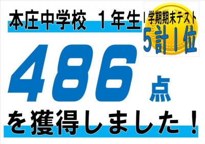 本庄中学校1年生と3年生で、5教科合計1位を獲得しました!200人以上のなかでの1位は立派です!それぞれ486点と473点という高得点です。たゆまぬ努力のたまものですね!