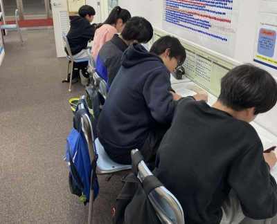 早くも生徒たちは意欲的に学習に取り組んでいます。自習室の利用者が増えただけでなく、毎日設定している「ケアデー(講師への質問時間)」の効果もあり、塾で学習を完結させる習慣が定着しつつあります。中には教室だけでなく廊下で学習に励む生徒も見受けられますが、当校では場所を問わず自習を推奨しているため、非常に好ましい状況と考えております!