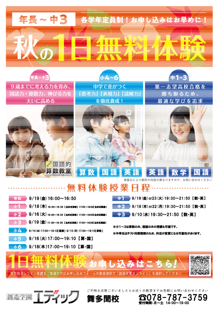 無料体験受付中です! お気軽にお問い合わせください!(小6、中2満席間近!)
