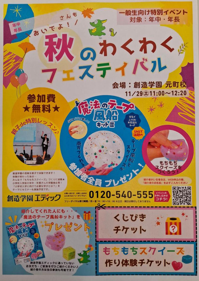 秋はイベントの季節!創造学園元町校では、年中・年長のお子様を対象に「秋のわくわくフェスティバル」を開催します!