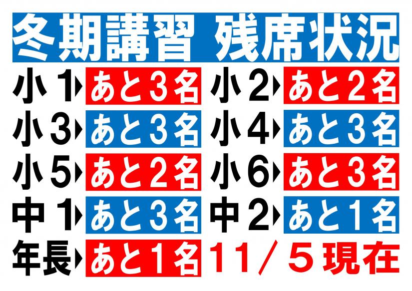 冬期講習の残席が少なくなってきました。受講をご検討中のかたはお急ぎください。