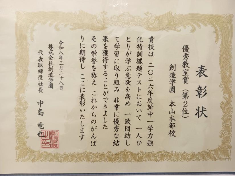 新中1学力強化特訓 ~本山本部校が全教室で第2位に輝きました!~