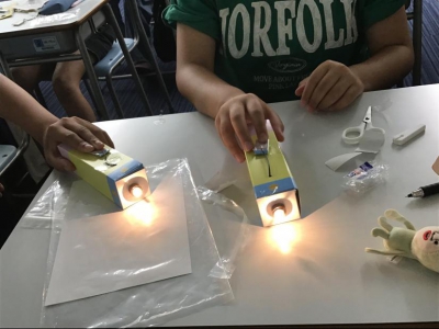 今月は小学4年生が「空気砲を作ろう」、小学5・6年生が「ライトのしくみ」でした。