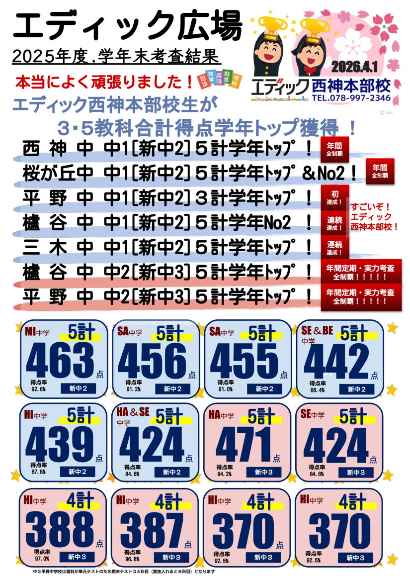 ★平野中学校 中2(新中3)2025年間全ての定期・実力考査5計学年トップは エディック西神本部校生!!!
