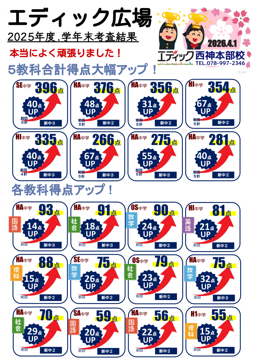 ★櫨谷中学校 中2(新中3)2025年間全ての定期・実力考査5計学年トップは エディック西神本部校生!!!
