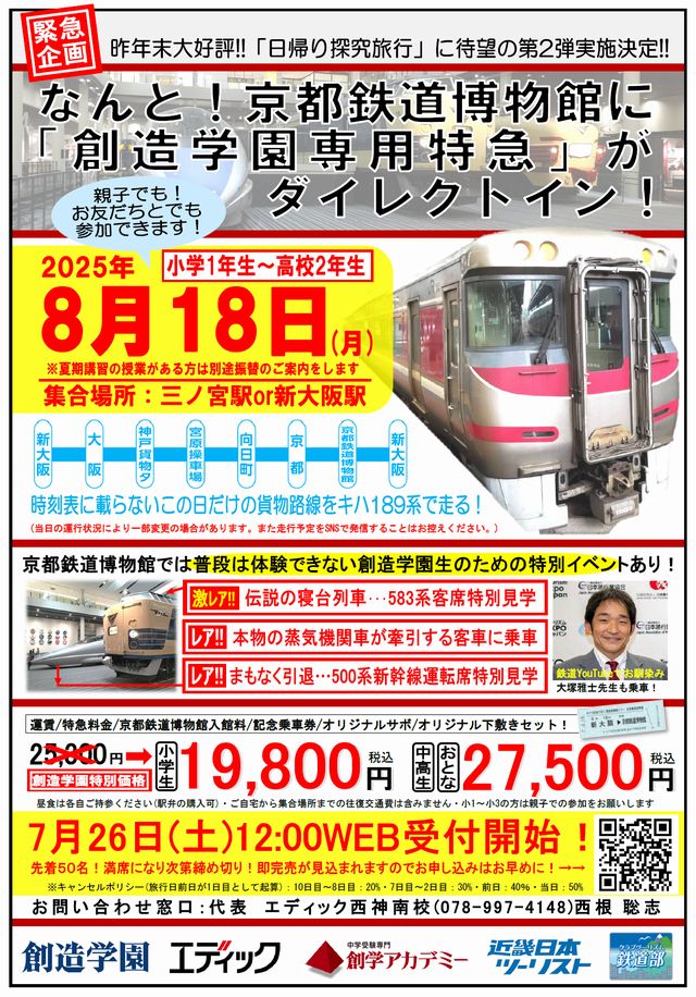 【まもなくお申込みスタート!】日帰り探究旅行第2弾!「創造学園専用特急」が京都鉄道博物館にダイレクトイン!