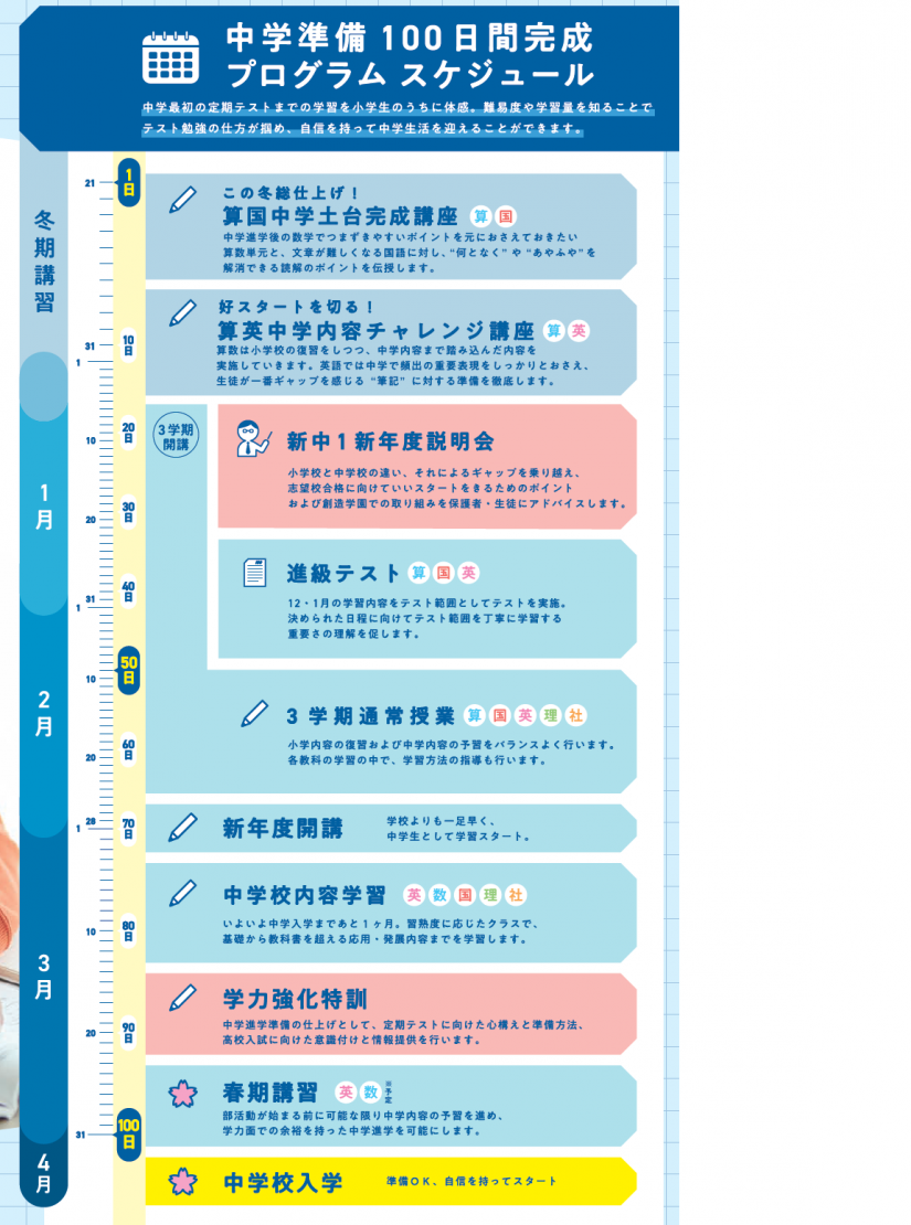 エディックの冬期講習は、小学内容の総仕上げとともに中学内容の先取り学習。学習面での不安を中学進学前に取り除きます。また、オリエンテーションやがんばりカップで学習意欲を引き出し、モチベーションも高めていきます。欠席やつまずきはケアデーで丁寧にフォロー。納得いくまで学習を支援することで、一人ひとりが新たな目標に自信を持って取り組んでいけます。エディックの冬期講習は、学習面・生活面の両方からみなさんをサポートし、中学最初のテストでライバル達に差をつけます!!みなさんも、この冬、学習習慣・生活習慣をしっかり固め、春から自信をもって中学生活の好スタートを切ろう!!
