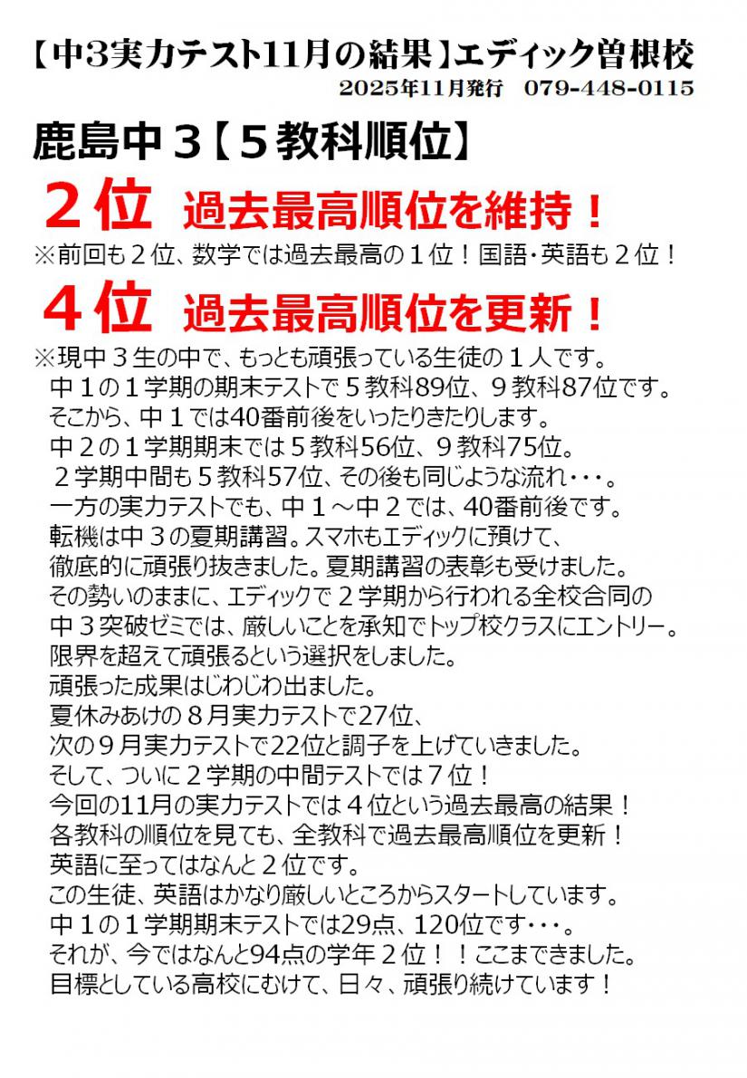 今回の11月の実力テストでは4位という過去最高の結果!