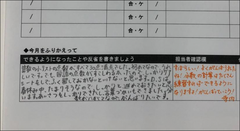 小学4年生~中学3年生の生徒のみなさんに、日々の宿題や小テストの結果などを記入してもらいます。また、毎月の目標を設定し、月末には達成できたかどうか振り返る機会を設けています。