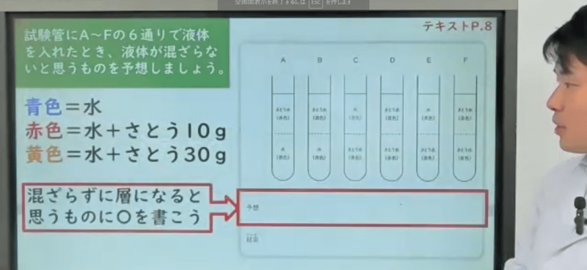 5月は「密度」に関する実験で、物質や水の温度による溶け方のちがいをキットを使って実験しました。