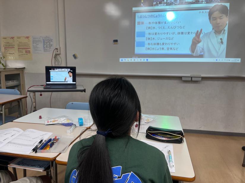 創造学園が持つ理科実験ラボから専門の先生がオンラインで授業を行い、教室にいる先生のサポートのもと、子どもたちはキットを用いて実験をおこないます。