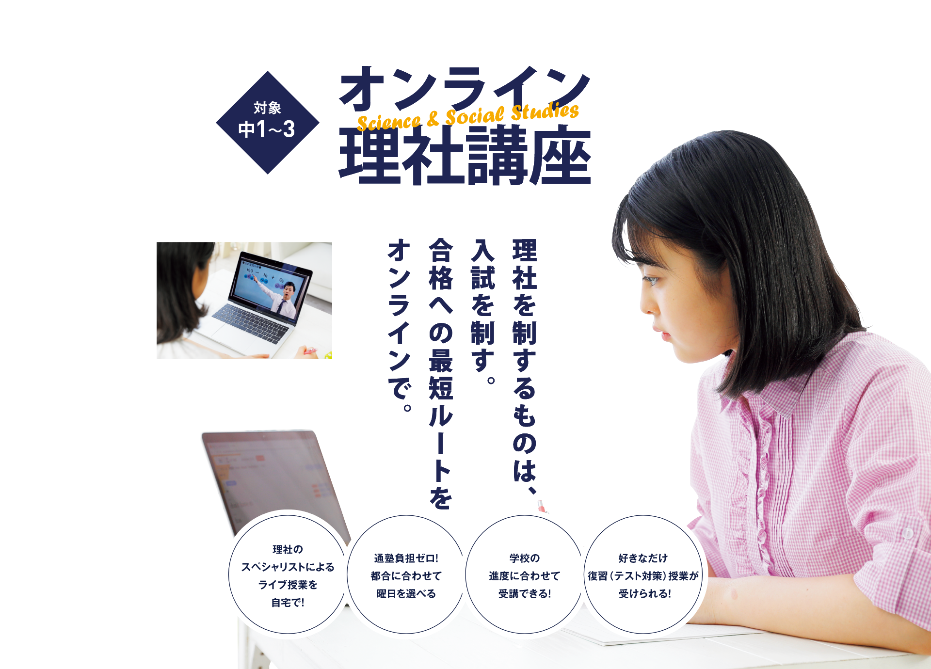 週2日は教室に通い英数国の学習。週1日は自宅から受講することで、部活動や習い事が忙しい中学生も無理なく5教科の勉強との両立が可能に。また「オンライン理社講座」は曜日を選択可能なので、予定に合わせて受講ができます。